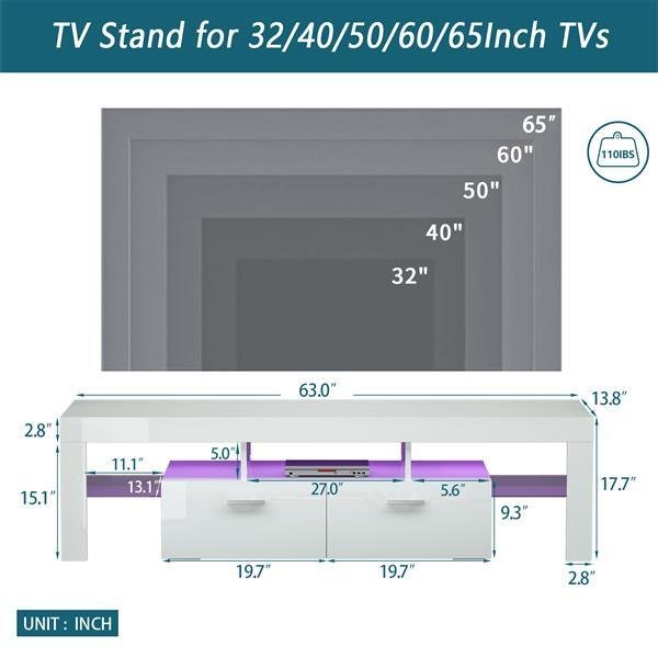The size of this TV cabinet:63inch*17.7inch*13.8inch,The whole can support up to 11  pounds, and a single drawer can support up to 3  pounds.this TV console fit up to 65inch TV.This TV stand with LED comes with 16 RGB LED BACKLIGHT, 4 LIGHT MODE & BRIGHTNESS ADJUSTMENTS.Equipped with REMOTE CONTROL makes changes of light ever easy.Strong cabinet, Strong Support and anti-skid pad to prevent scratches on the floor, cabinet after the increase of cross-bar, further improve the stability of the cabinet.Featuring a modern and simple design, this TV Stand with Led fits with different room theme, and the LED lights could create different atmosphere for your room.This TV bracket adopts E1 Particleboard, brand hardware, imported adhesive paper, scratch-proof, waterproof, strong and durable.This TV cabinet with a clear assembly instructions, each plate and accessories with a number, you can follow the instructions and number of the Assembly, is your installation more clear and convenient.