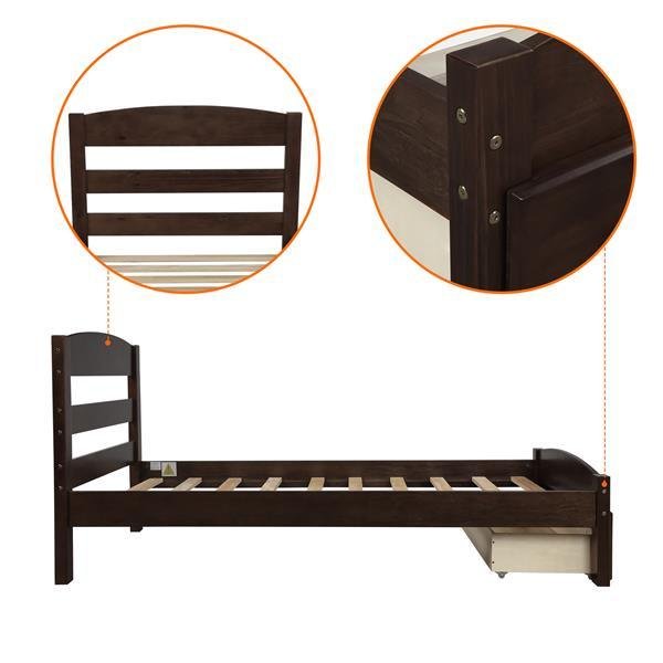 Upgrade your space with this sleek twin platform bed frame in an elegant espresso finish — designed for both style and function. It features built-in under-bed storage with a smooth-rolling drawer and a sturdy wood slat support system that eliminates the need for a box spring. With its low-profile design and durable construction, this bed frame is perfect for guest rooms, kids’ rooms, or apartments. Maximize storage and enjoy a clean, modern look.