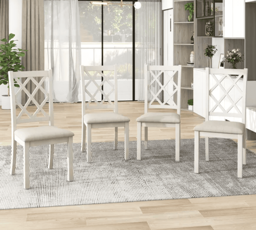 Upgrade your dining space with this stylish 5-piece set, featuring a round dining table and 4 cross-back chairs. Perfect for up to 4 people, it combines mid-century design with durable construction, featuring a sturdy MDF tabletop and solid rubberwood legs. The comfortable chairs are upholstered in breathable fabric with soft foam cushions. Ideal for smaller spaces like eat-in kitchens or cozy dining areas, this set adds both charm and functionality to any room.