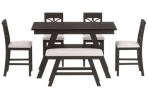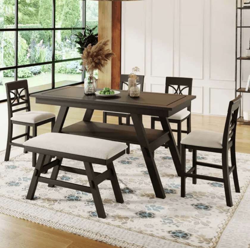 • ounter Height 6-Piece Dining Set Create an inviting and comfortable space with this farmhouse counter height dining set. Featuring an understated silhouette with clean lines, this counter-height dining table brings enough seating place for a large family. With 4 dining chairs and a bench, there are always freedom and flexibility to arrange your space with the way you like.