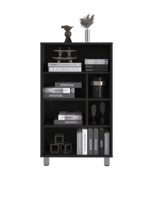 The Midway Bookcase offers the perfect solution for stylish and functional storage in your office or home. This modern bookcase features one upper shelf (9' H x 22.4' W), two left middle shelves (8.2' H x 14.4' W), two right middle shelves (8.2' H x 7.4' W), and one lower shelf (9' H x 22.4' W). Designed with a sleek black manufactured wood finish, the variety of shelf sizes makes it easy to store books, decor, and office supplies, making the most of your space while adding a contemporary touch to your room.Dimensions: Height: 40.6'Width: 23.6' Depth: 11.8'