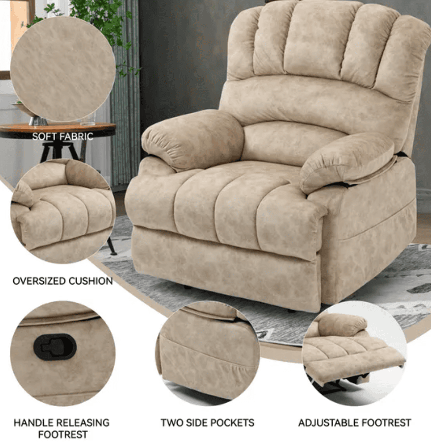 OVERSIZED RECLINER CHAIR: You can pull the side button to control the recline of the recliner chair, which means you can get any position you want, it's reclining 155 degrees maximum.