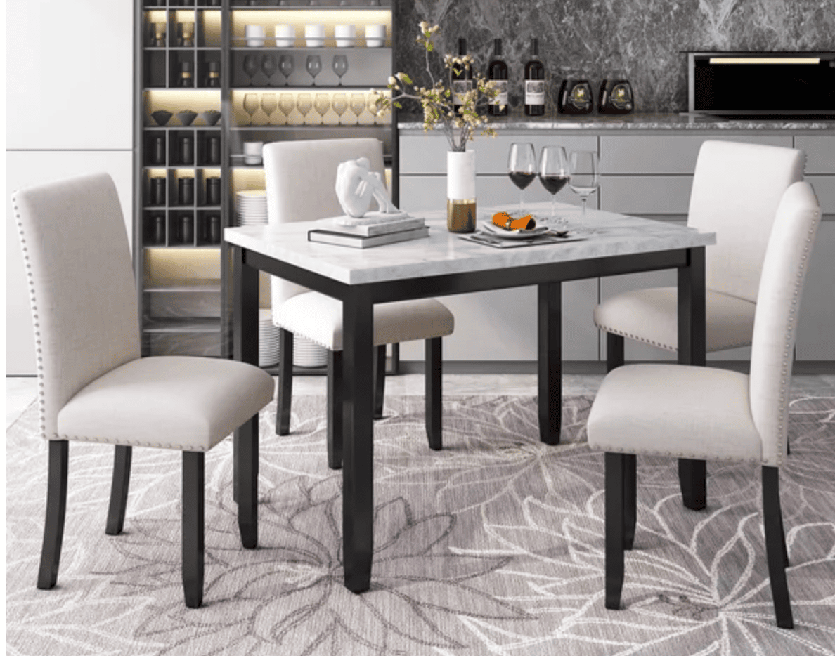 Add a touch of elegance to your dining area with the Faux Marble 5-Piece Dining Set. Featuring a sleek, modern design, this set includes a stunning marble table and four cushioned chairs, perfect for family meals or entertaining guests. The table's MDF and rubber wood frame offers stability, while the thick 4.3" cushioned seats ensure comfort during long dinners. With a stylish marble tabletop and copper nail accents, this set blends beauty with durability. Easy to assemble and easy to maintain, it’s the perfect addition to any kitchen or dining room. Enjoy both luxury and functionality with this family-friendly dining set.