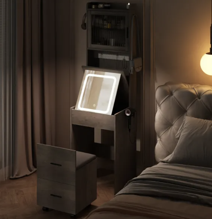 This compact vanity desk is a perfect solution for bedrooms or apartments where space is limited, but you want a full-featured makeup and storage station. It combines a sleek mirror with built‑in LED lighting, ample storage shelves and drawers, a charging station, and a hidden-storage stool — making it a functional and stylish addition to any room. Whether you use it for daily makeup, skincare, styling, or as a small desk/dressing table, it keeps your essentials organized and accessible while maximizing space.
