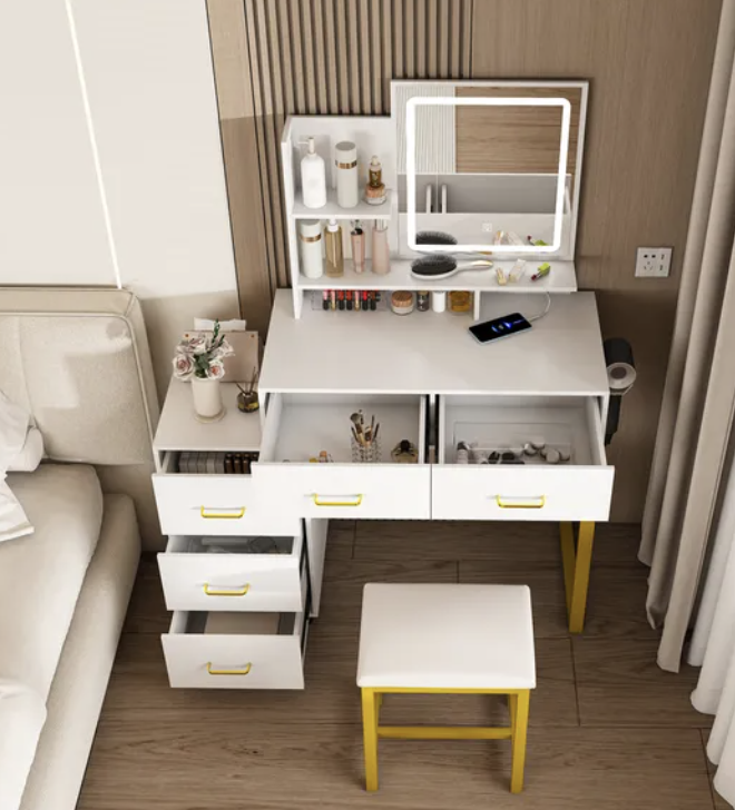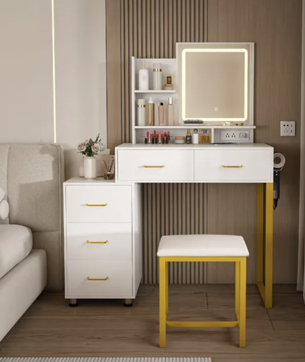 This elegant Makeup Vanity Set combines practicality and style — a full-featured dressing station that gives you a dedicated space for beauty routines, storage, and bedroom organization. With a built-in mirror, spacious countertop, and multiple drawers, it’s designed to keep cosmetics, skincare, accessories, and personal items neatly organized. The vanity doubles as a nightstand or dresser, making it a versatile addition to bedrooms of any size. Perfect for daily makeup, skincare routines, jewelry organization, or even as a small desk for light tasks.