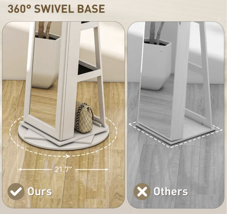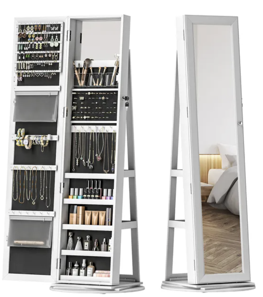 Store and style your jewelry in one elegant piece with this HOMCOM 360° swivel jewelry armoire. Featuring a full-length mirror that rotates smoothly, this lockable cabinet ensures your accessories stay safe and organized. Inside, you'll find space for earrings, rings, necklaces, and more, plus built-in shelving and a small inner mirror for easy access. It’s the perfect addition to any bedroom or dressing room.