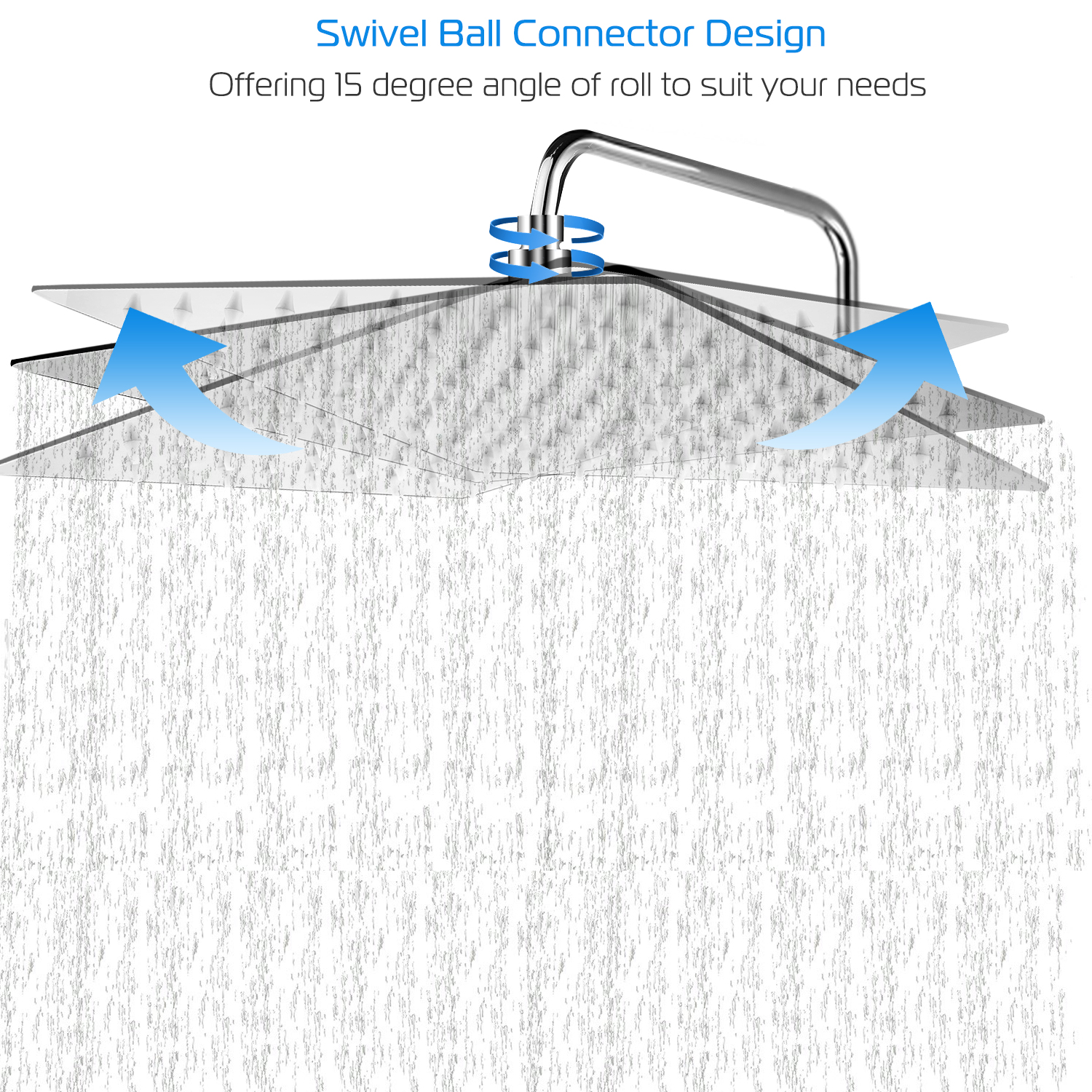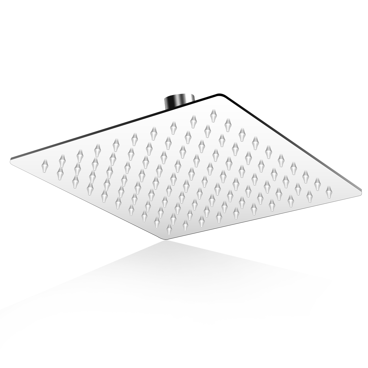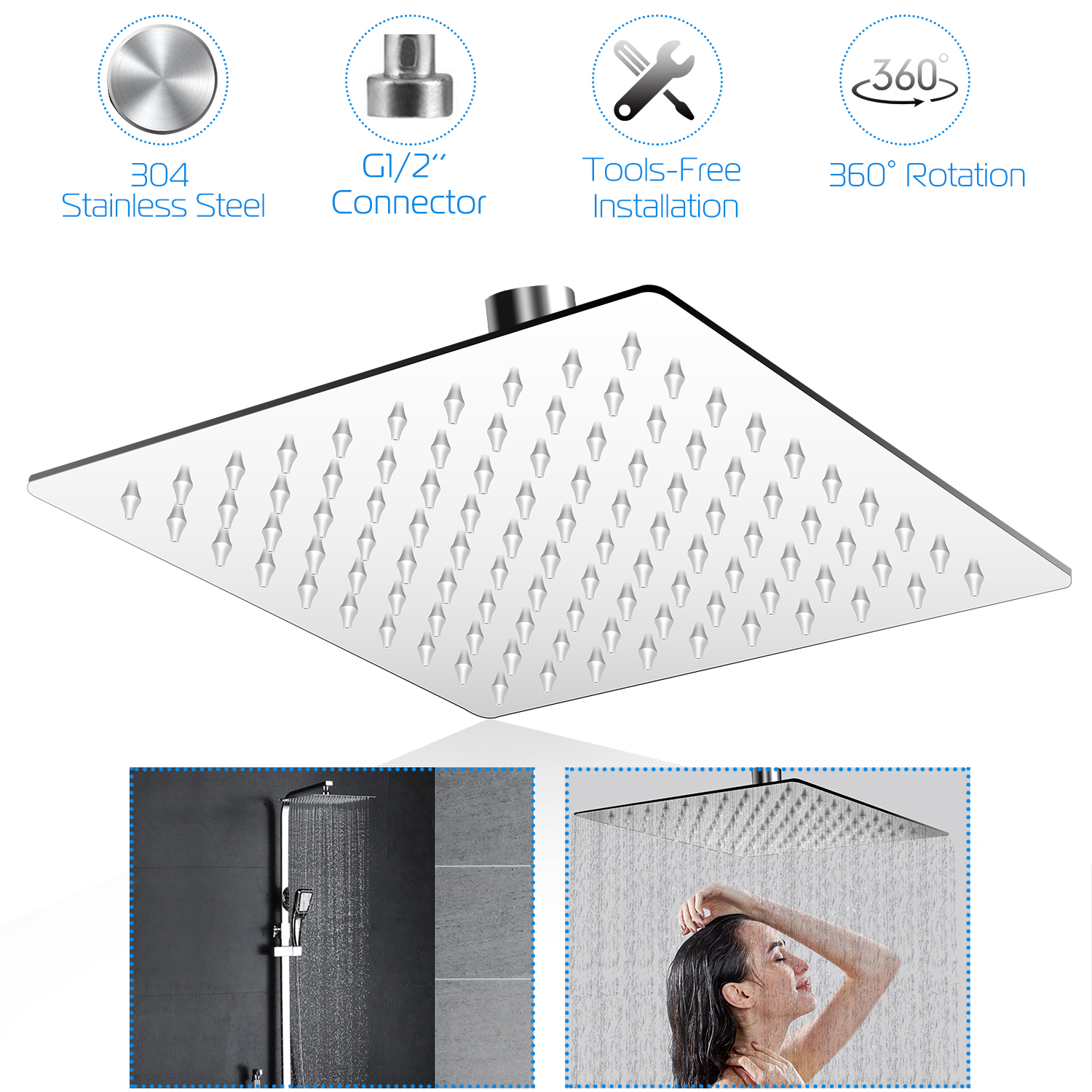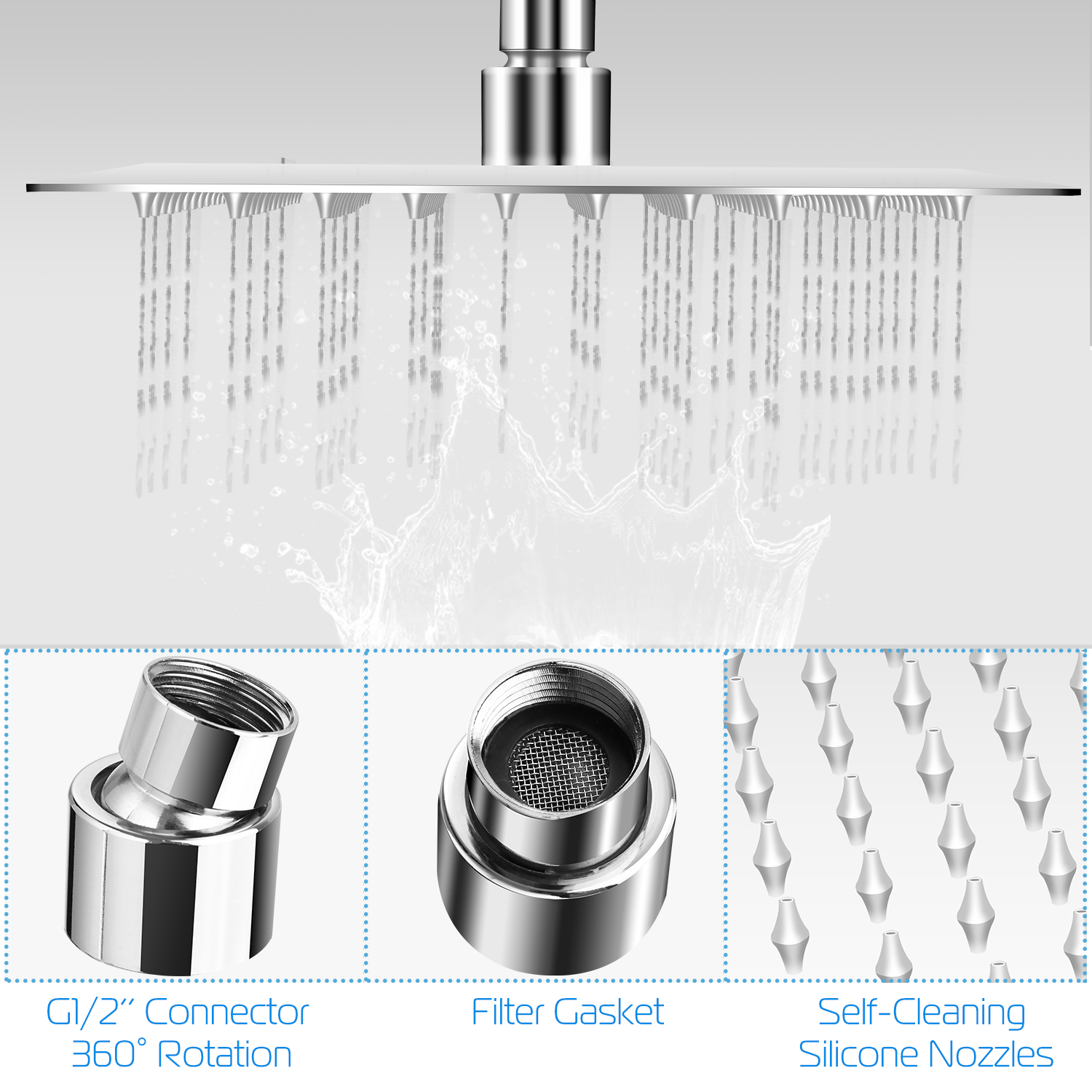 The rain shower head features high-grade mirror stainless steel, silicone rub-clean nozzle and 15ยฐ tilt rotatable head to offer you comfortable bath experience. The 0.08in/2mm-thick ultra-thin top shower head offers strong water pressure. Comes with 100pcs self-cleaning silicone nozzles provide clean healthy water flow and a filter gasket included for secondary filtration. Standard G1/2โ€™โ€™ connector fits for universal overhead shower arm with easy installation.