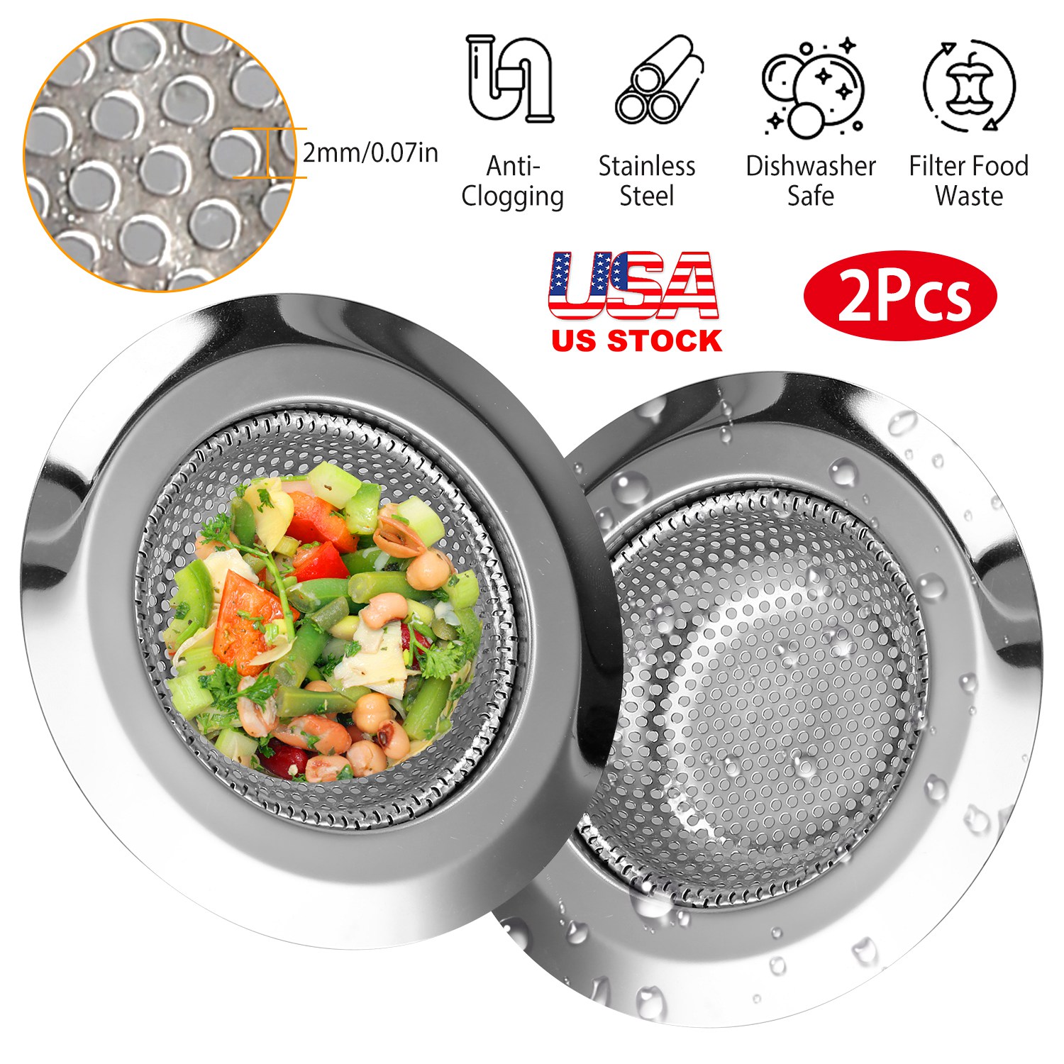 2Pcs Stainless steel strainers are suited for long-lasting protection against plumb clogging and save much time on dish washing. 2mm/0.07in Diameter perforation holes let liquid flow seamlessly into the drain while it blocks food particles. 0.74in Flat rim rests over sink's drain. Quickly wash with warm soapy water to keep the mirror finish shine impeccable over time. Dishwasher safe and they are suitable for 2.96in-3.93in drain strainer outlet. Please measure before purchasing.