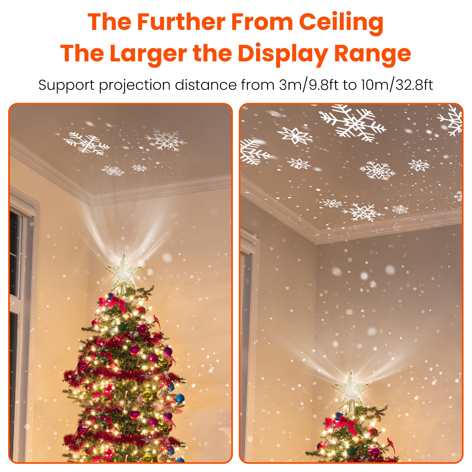 Christmas is coming, our topper star with snowflake projector light is a perfect decoration for Christmas tree. Featured with hollow-out design and golden glitter coating, this treetop star is an eye-catching and attractive decoration for living room, bedroom, dining room, office, restaurant, shopping mall, etc.. Built-in LED projector light with auto-moving motor can display clear and dynamic white snowflakes on the ceiling, creating romantic and dreamy atmosphere. The further away from the ceiling, the larger the projection range.