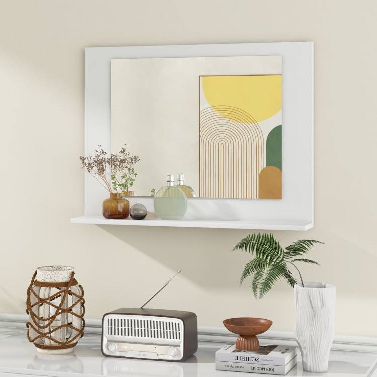 This Rectangular Bathroom Wall Mirror with Storage Shelf and White Wood Frame will elevate your bathroom decoration with a convenient open shelf, allowing you to display decorative items or store bathroom essentials for easy access. The copper-free silver mirror, measuring 17.5" x 14", offers HD and distortion-free reflection, which makes it perfect for grooming routines, makeup applications and outfit checking. Crafted with a high-quality engineered wood frame, this rectangle bathroom mirror adds a touch of elegance to your space while providing durability and a timeless aesthetic appeal. You can maximize your space with this versatile wall mirror, combining both the functionality of a mirror and the practicality of a shelf in one elegant piece. It is suitable for bathrooms, living rooms, entryways, etc. The wall mirror requires no assembly when it arrives, and you only need to fix it to the wall. The package includes the necessary mounting hardware. Product dimension: 23.5" x 4" x 17.5" (L x W x H).