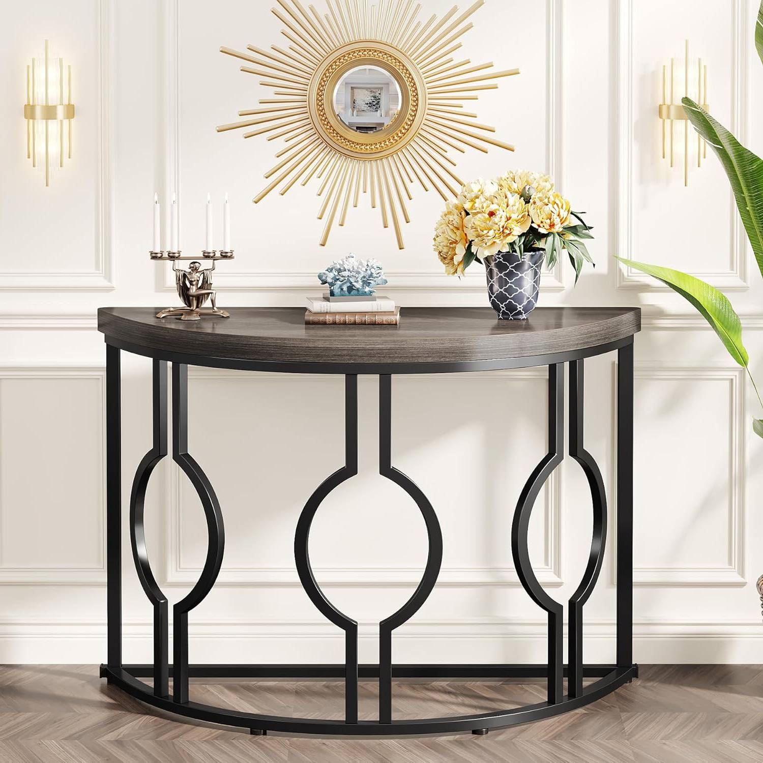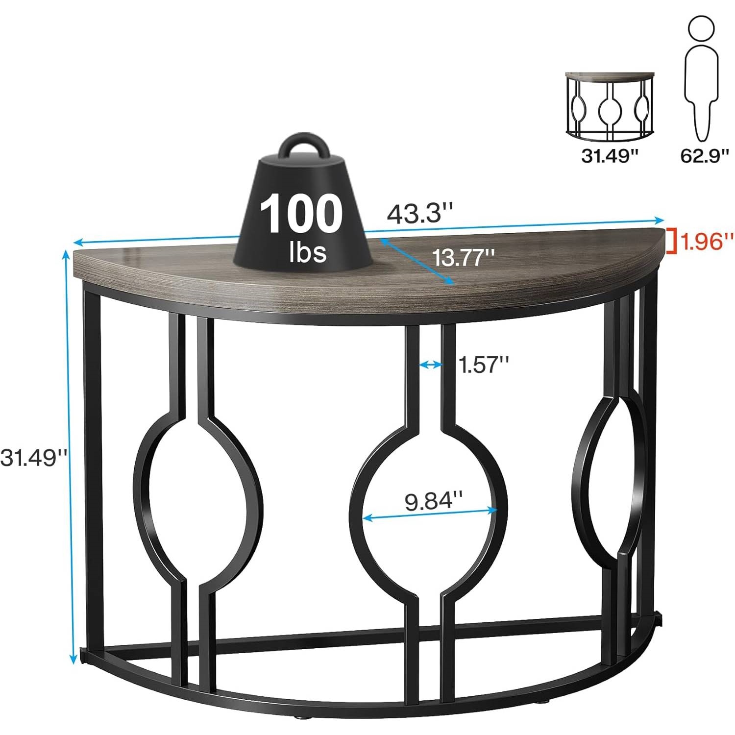 Admire this Modern 43-inch Half Moon Accent Sofa Table with Grey Wood Top Black Frame with a unique curved design accented by chic geometrical frames. Its dark distressed finish lends a retro-industrial charm, making this semi-circle table a perfect statement piece. Sized at 31.5''H x 43.3''L x 13.8''D, this slim accent table can fit in your foyer, hallway, or living room. It serves as a sofa couch table for lamps and books, a beautiful entryway table to hang a mirror above, or an exquisite end table for coffee. At 1.96รขโ‚ฌลกรƒโ€žรƒยถรขห†ลกรƒโ€˜รขห†ลกรโ‚ฌ thickness, the retro textured manufactured wood displays an abstract texture with a smooth surface, perfect for display from sculptures to decorative vases. Maximum weight limit: 100 lbs. Made from durable wood, the table is scratch, stain-resistant and waterproof. The metal frame is powder-coated for wear and rust resistance. Adjustable foot pads ensure stability and prevent floor scratching. All required tools are included. Follow the detailed instructions to assemble this chic wood half-moon entry table in just 15 minutes. We also offer a 12-month guarantee and friendly customer service for a worry-free purchase.