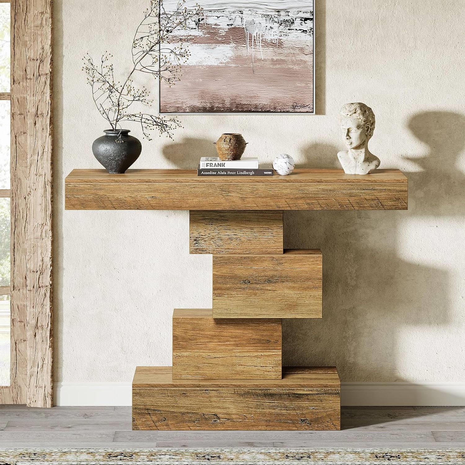 Infused with rustic warmth, this Modern Farmhouse 42-inch Entryway Accent Sofa Table in Light Brown Wood Finish has a brown and wood grain design that brings a vintage farmhouse feel to your living space. The sofa wood table's unique geometric base is perfect for showcasing items from lamps to family photos, adding a decorative accent to any foyer or hallway. Made from E1 particle board, this thick wood table can hold up to 100lbs. Plus, the water-proof melamine finish makes clean-ups simple. Whether as a sofa back table, entryway greeter, or accent piece, this hallway table's versatile design enhances any space. The table comes with detailed instructions, labeled parts, and all the hardware you'll need for easy assembly. And donรขโ‚ฌลกรƒโ€žรƒยถรขห†ลกรƒโ€˜รขห†ลกร‚ยฅt hesitate to contact our friendly customer service with any concerns!