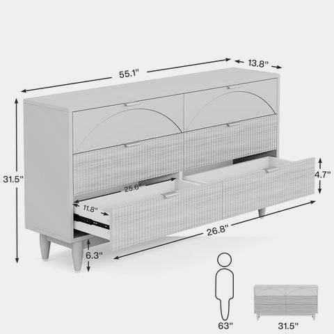 This stylish Vintage Retro Brown Light Wooden 6 Drawer Dresser, boasting a sleek look, unique double-arcs, and wavy fronts for a modern vibe. With dimensions of 55.12"W x 13.78"D x 31.5"H, this dresser provides ample storage. It's perfect for organizing essentials and displaying decor on its large top surface. Made from premium MDF for durability, it features smooth metal glides for easy access and robust legs for stability. This versatile piece is suitable for bedrooms, living rooms, or hallways. It's perfect for compact spaces, serving as a TV stand, bedside table, or storage cabinet.