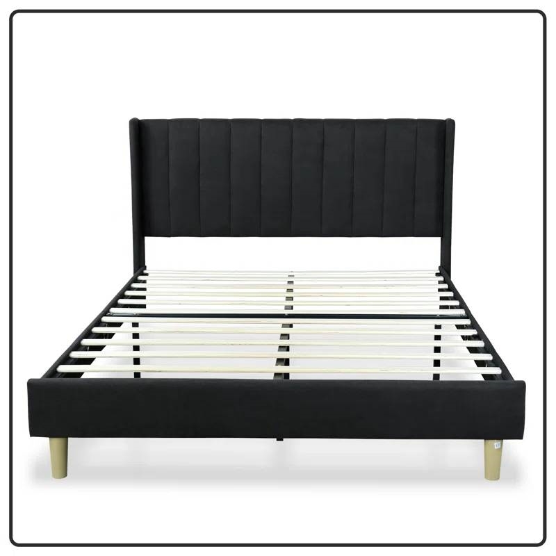 This Queen size Mid-Century Black Linen Platform Bed Frame with Upholstered Headboard showcases a low-profile silhouette and clean lines for a mid-century modern look in your bedroom or guest room. The frame is built from engineered wood, and it rests on splayed legs with a light brown finish. This bed is upholstered in linen and/or velvet with a medley of colors to choose from that best suits your style. We love how the tall wingback headboard is padded with chic channel tufting, so you have a cushioned spot to relax for some late-night reading. Best of all, a box spring is not necessary. A mattress is not included. Note: The color might be affected by lighting conditions.