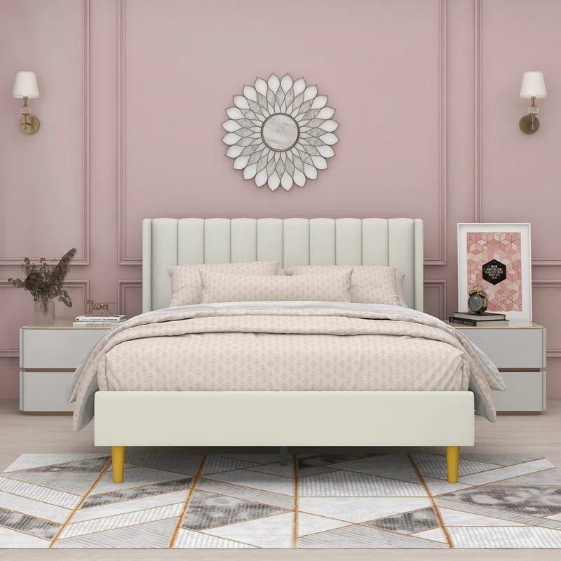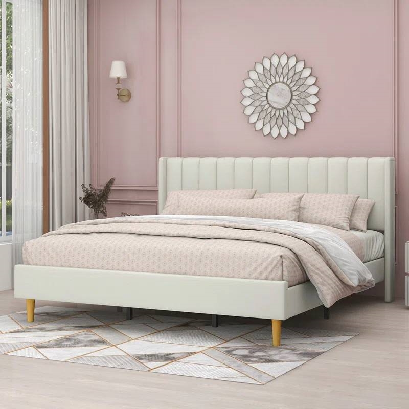 • Queen Mid-Century Platform Bed Frame with Cream Velvet Upholstered Headboard