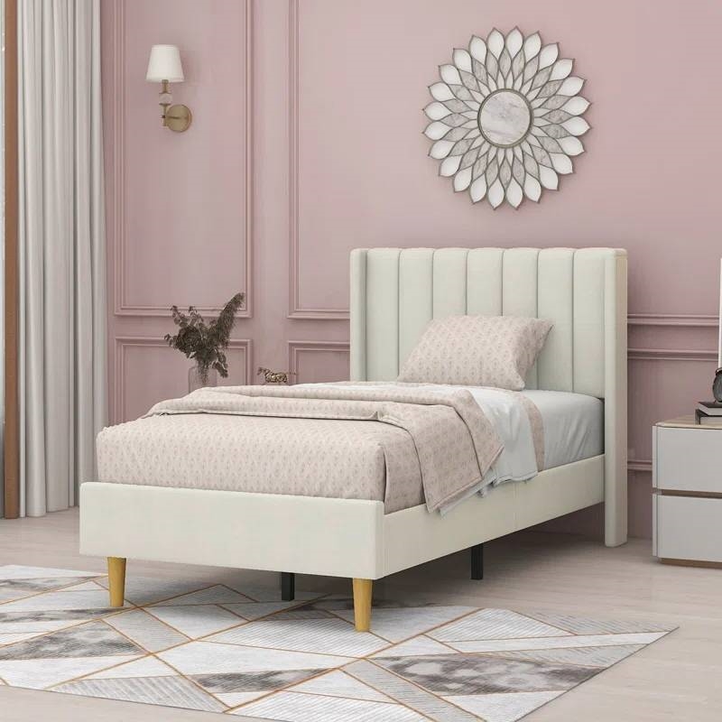 Twin size Mid-Century Platform Bed Frame with Cream Velvet Upholstered Headboard