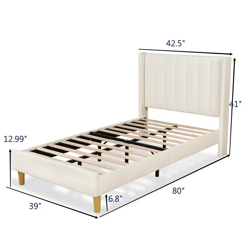 • Twin size Mid-Century Platform Bed Frame with Cream Velvet Upholstered Headboard