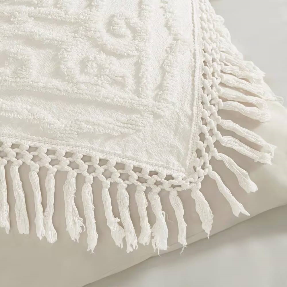 The King 100-Percent Cotton Chenille Bedspread with Fringe Hem in Off-White provides an alluring shabby elegance update to your bedroom. A decorative fringe hem adds dimension, while 2 matching shams (1 in twin/twin XL) complete the boho look. Perfect for all-season use, this bedding set is also Oeko-tex certified, meaning it does not contain any harmful substances or chemicals to ensure quality comfort and wellness. Due to the nature of the chenille fabric, some shedding will occur naturally in the first 3-4 washes.