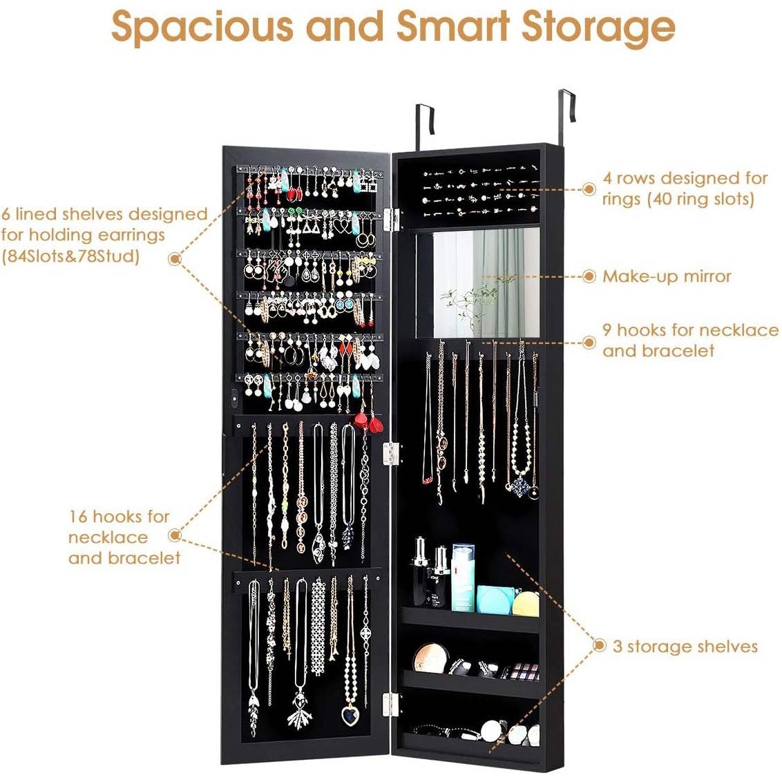 This 2-in-1 Black Wall or Door Mounted Jewelry Organizer Full Length Mirror can be both wall mounted and door mounted and the height is also adjustable as you need. No matter which mounting you choose, it can save much space for you. The mounting height is adjustable. This 2-in-1 Black Wall or Door Mounted Jewelry Organizer Full Length Mirror includes 6 lined shelves for holding earrings (84 earring slots & 78 earring holes), 25 hooks for necklace and bracelet, 4 rows of 40 ring slots, 3 storage shelves and an inside makeup mirror. It has a super smart inside space to keep all your jewelry organized and neatly displayed. This jewelry cabinet is simple in shape and uses the MDF as main frame material. The frame is thick and with a certain strength. Our MDF boards are specially customized. They are not ordinary materials in the market. Our coating is very smooth and looks very textured and you will be happy to receive it. This jewelry cabinet is a combination of a full-length mirror and a jewelry cabinet. It can be used as a mirror for you to dress. It can also be used as a practical jewelry cabinet to store your daily jewelry, giving you a clean and spacious space.
