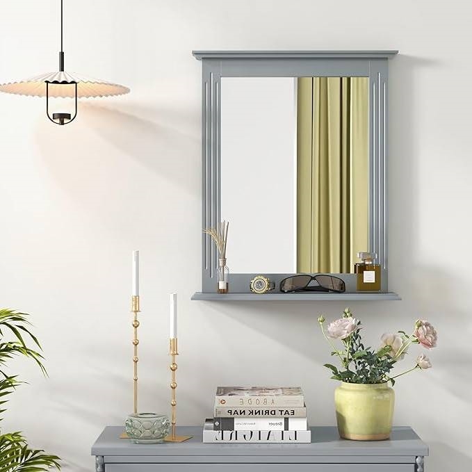 This 27-in x 22.5-in Bathroom Wall Mirror with Shelf in Gray Wood Finish is made of durable MDF with a high-resolution, large mirror and waterproof white paint surface. The mirror features a bottom shelf for storing skincare products, cups, combs, and perfume, while its compact design saves space. With stylish grooves on the sides, the mirror adds elegance to any room and is sure to impress guests. Suitable for hallways, bedrooms, bathrooms, hotels, and more, the mirror can be hung or used as a dressing mirror to visually enhance the space.