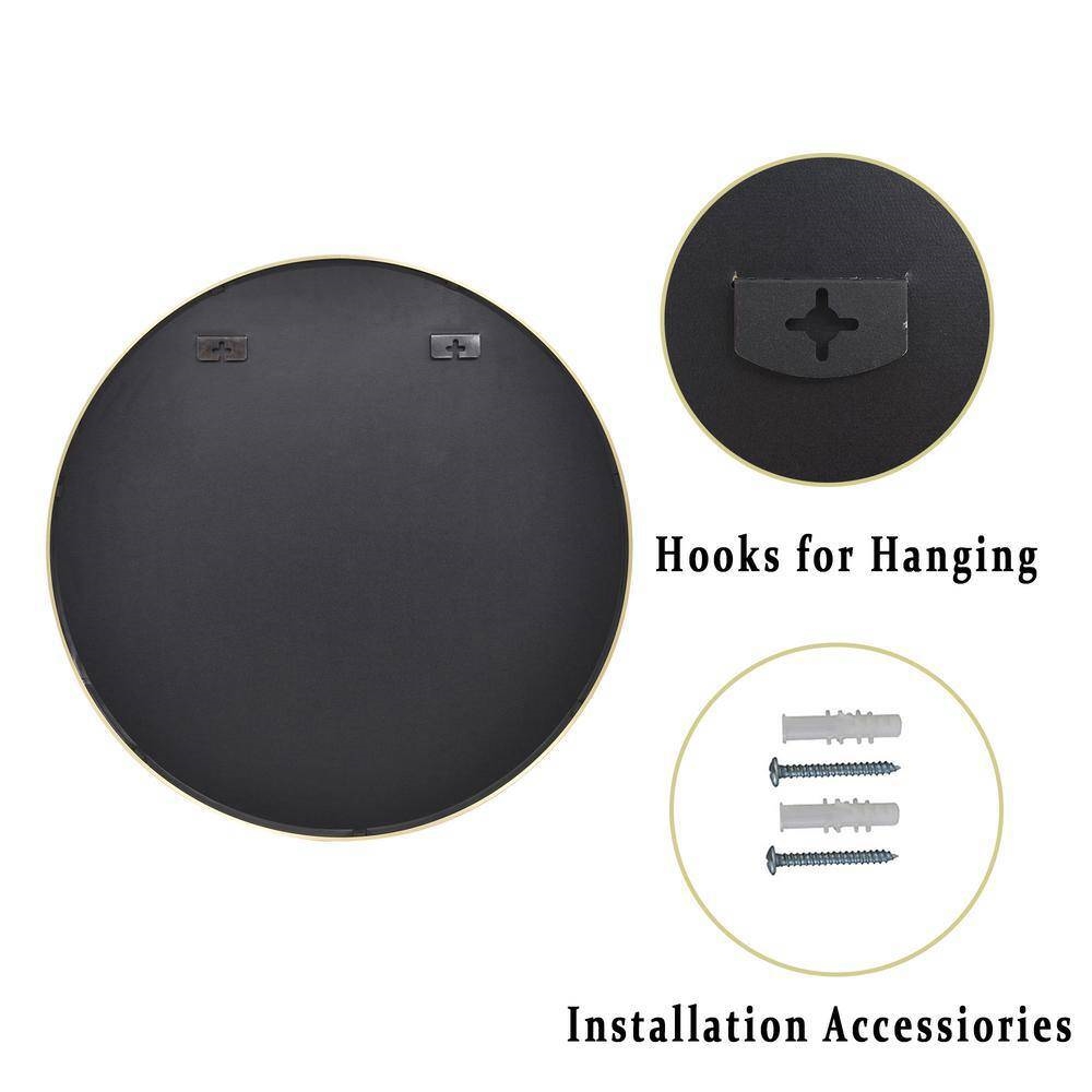 The Round 30-inch Circular Bathroom Wall Mirror with Gold Frame brings a blend of modernity and elegance to your walls. Its sleek gold metal frame not only adds style but also creates depth and dimension within your space. With its substantial size and minimalist design, this wall mirror is perfect for amplifying both natural and artificial light, thus illuminating various areas like bedrooms, bathrooms, hallways, entryways, living rooms, and offices. The mirror is inset within the frame, enhancing the overall sense of depth and dimension in your surroundings. It arrives at your doorstep with enhanced packaging, ensuring a safe delivery without damage. Crafted with a medium density fiberboard backing, this mirror reduces the likelihood of warping that can be associated with solid wood backings. This choice of material also enhances stability, offering a reassuring durability. For your convenience, this mirror, despite its size, is impressively lightweight. It arrives ready to adorn your wall straight out of the box, complete with the necessary mounting hardware.