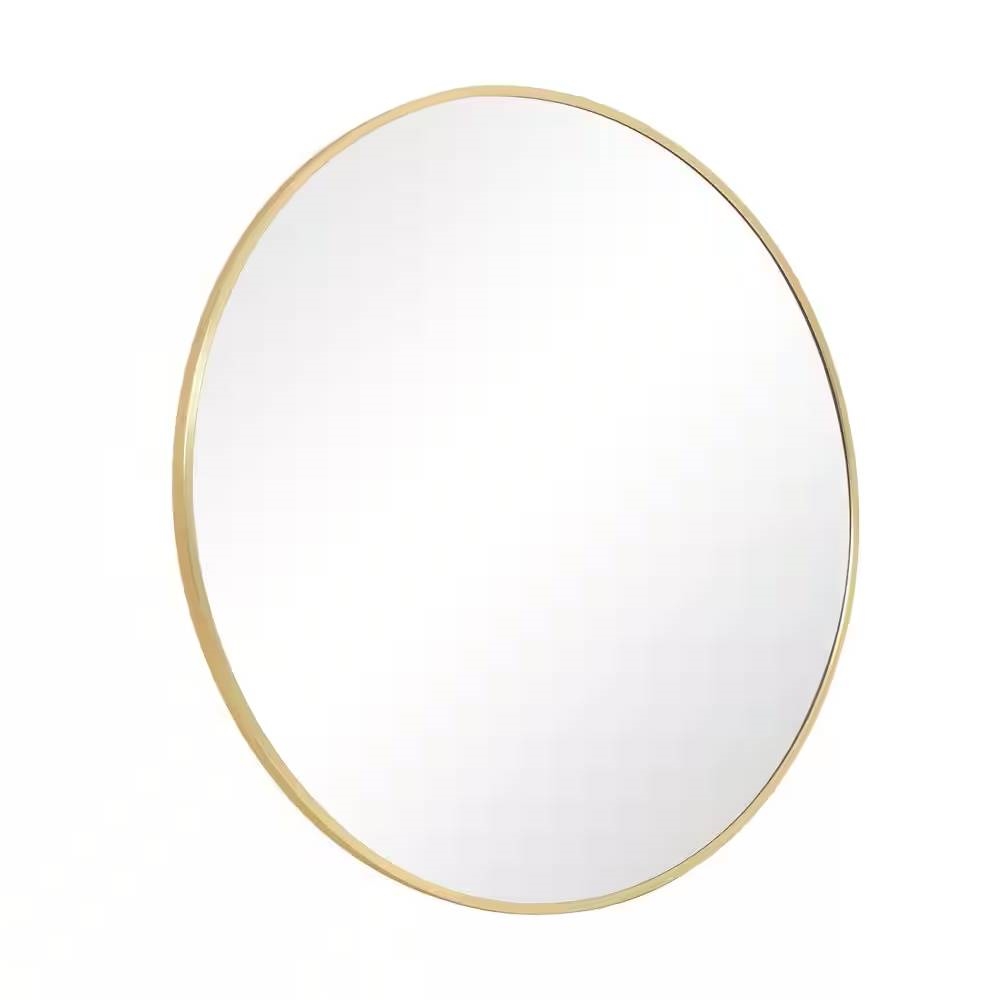 The Round 24-inch Circular Bathroom Wall Mirror with Gold Frame brings a blend of modernity and elegance to your walls. Its sleek gold metal frame not only adds style but also creates depth and dimension within your space. With its substantial size and minimalist design, this wall mirror is perfect for amplifying both natural and artificial light, thus illuminating various areas like bedrooms, bathrooms, hallways, entryways, living rooms, and offices. The mirror is inset within the frame, enhancing the overall sense of depth and dimension in your surroundings. It arrives at your doorstep with enhanced packaging, ensuring a safe delivery without damage. Crafted with a medium density fiberboard backing, this mirror reduces the likelihood of warping that can be associated with solid wood backings. This choice of material also enhances stability, offering a reassuring durability. For your convenience, this mirror, despite its size, is impressively lightweight. It arrives ready to adorn your wall straight out of the box, complete with the necessary mounting hardware.