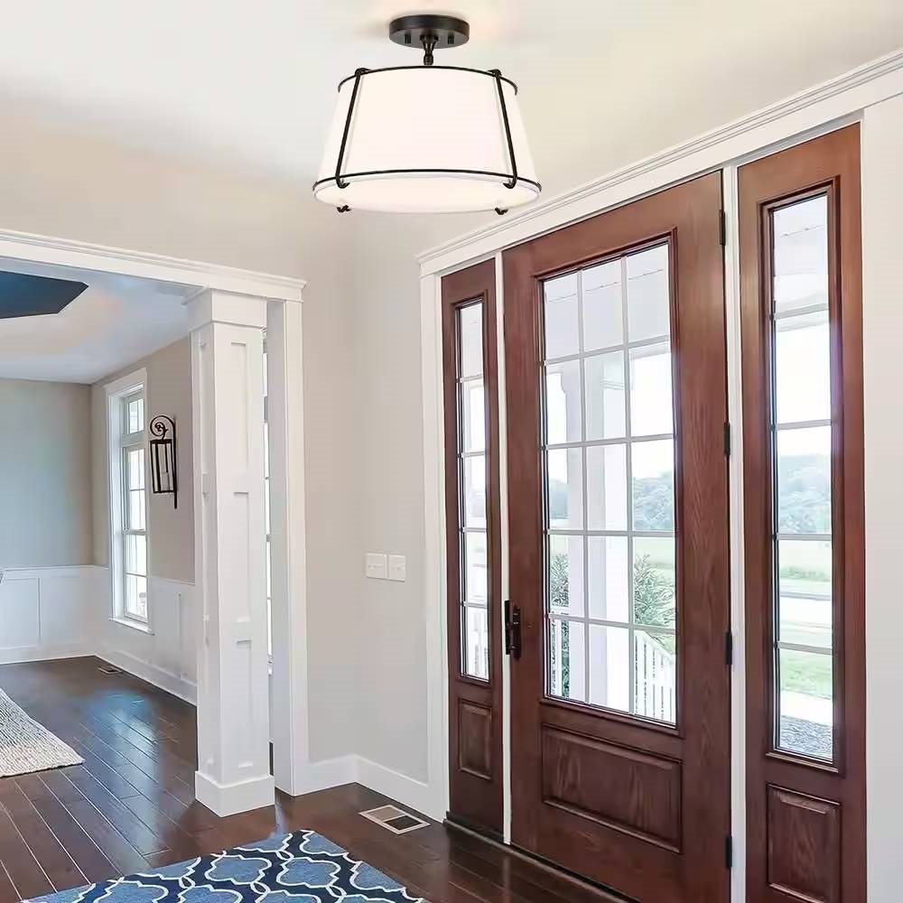 The 2-Light Round 15-inch White Drum Ceiling Light w/ Black Metal - Semi-Flush Mount has an unique blend of transitional with contemporary elements. The empire drum shape white fabric shade and matte black hardware/accents make this fixture great for rooms with variety of decors, perfect for any urban decor or to help you create the look of city living, which is an ideal selection for hallway, entryway, stairway, door way, closet, pantry, kitchen, sitting room or a foyer to bring warmth to a living room or bedroom.