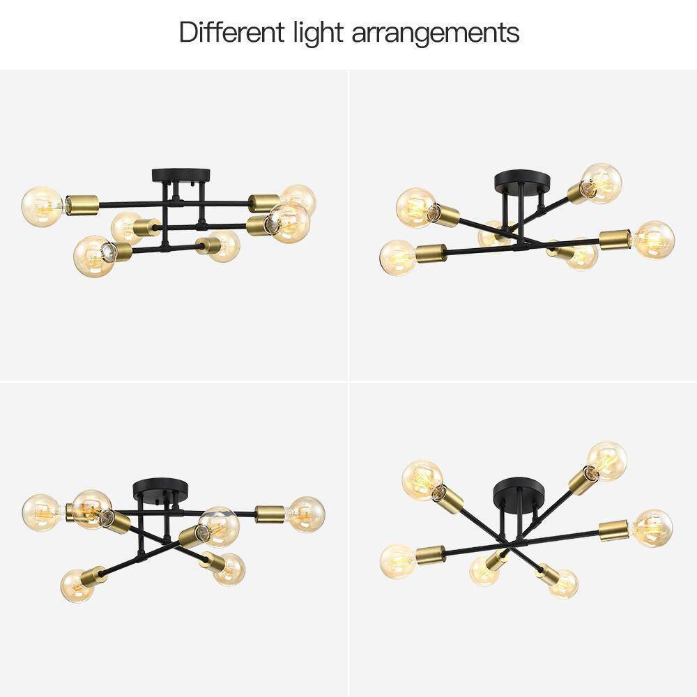 This Mid-Century Sputnik Style 6-Light Black Gold Ceiling Light - Semi Flush Mount comes with multi-directional 6-lights, its arms are movable to enable different lighting arrangements as you need. The Mid-Century Modern style with exposed bulbs brings back a nostalgic & reminiscent feelings, while its minimalist shape & contemporary colors make this ceiling light fixture a refined and easy fit with various room settings such as modern/contemporary, transitional, minimalist, or even industrial, a widely used ceiling chandelier light in bedroom, foyer, entrance hall, dining room, lounge or office. Bulbs need to be purchased separately.