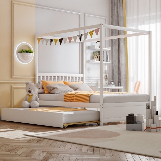 This White Full Size Canopy Platform Bed with Twin Roller Trundle Bed is a perfect addition to any kids room, college dorm, or guest bedroom. Great for small spaces and has a practical 2 in 1 design to 2 comfortably. Twin Size Trundle has PV casters for effortless puling. Comes with sturdy plywood slats to accommodate a mattress of your choice. Mattresses are NOT included. Both beds are platform beds and require no box springs.