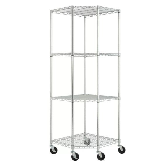 This Heavy Duty 4-Tier Corner Storage Rack Shelving Unit with Casters is perfect to maximize any corner space. It can hold any of your boxes, cookware, tools, and everything in between.