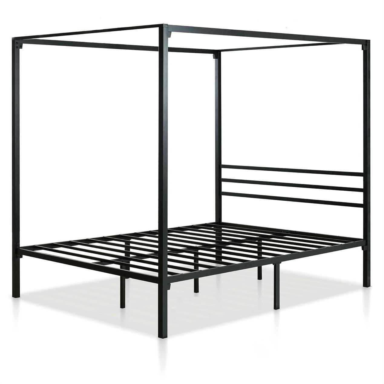 This Full size Modern Black Metal Canopy Bed Frame with four canopy posts, makes a handsome bedroom centerpiece. This easy to assemble platform bed features steel slats that provide strong support for your memory foam, hybrid, or spring mattress. This platform bed is 14 inches high with clearance under the frame for valuable under bed storage. Mattress not included. Stylish and strong support for your mattress without the need for a box spring.