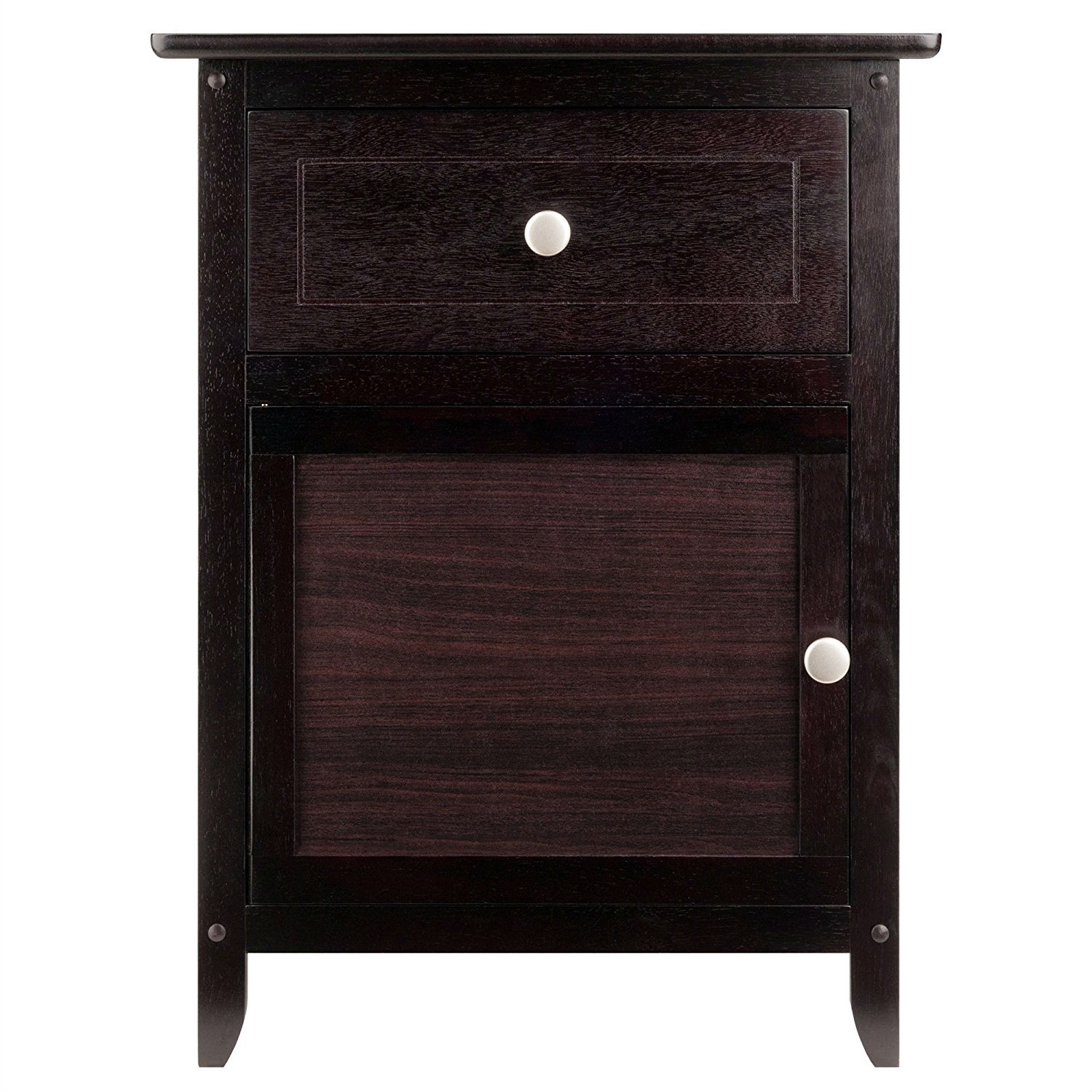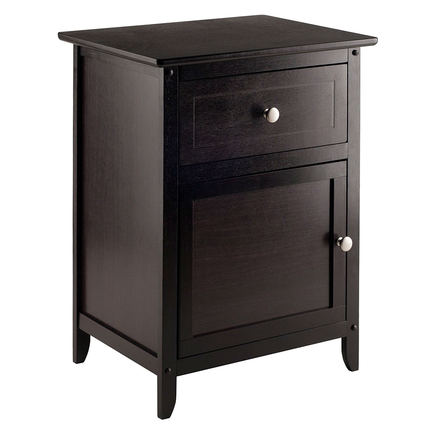 Tuck remote controls and drink coasters inside the drawer of this Espresso Wood End Table Nightstand Accent Table. With its clean lines, slightly tapered legs, and uncomplicated design, the table fits easily into traditional and more modern interiors alike. Set the table next to a sofa in the living room, or use as a night stand with a lamp placed on top. The table is crafted out of wood/composite with a warm espresso finish. For storage, the table offers a small drawer and a single-shelf cabinet. Both the drawer and the cabinet door provide a round satin nickel knob for opening and closing; the cabinetรขโ‚ฌลกรƒโ€žรƒยถรขห†ลกรƒโ€˜รขห†ลกร‚ยฅs hinges are pre-installed on the right side of the door to swing open from left to right only. Upon delivery, the table requires home assembly and comes with necessary hardware and tools. The assembled table measures 19 inches wide by 15 inches deep by 25 inches high. This item weighs 21 pounds upon shipping.