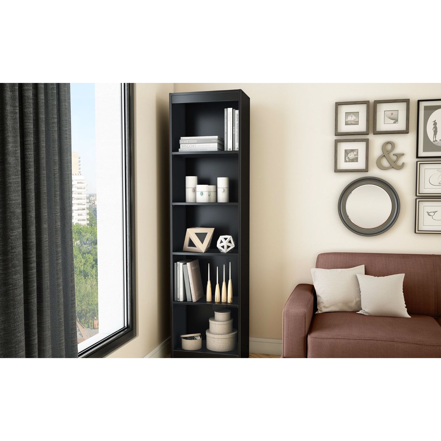 This 5-Shelf Narrow Bookcase Black Finish is ideal for your binders, books or decorative items. It features 5 open, practical and accessible storage spaces, separated by 2 fixed and 3 adjustable shelves that can support up to 30lbs. each. Its refined lines harmonize seamlessly with virtually any dรขโ‚ฌลกรƒย รƒยถร‚ยฌร‚ยฉcor. Both functional and attractive with its sleek contemporary styling, this bookcase is sure to enhance the look of any room in your home. It is also available in Pure White, Chocolate, Royal Cherry or Morgan Cherry finish. It measures 19-inch wide by 11-1/2-inch deep by 71-1/4-inch high. It is delivered in a box measuring 77-3/4-inch by 12-3/4-inch by 3-1/2-inch and weighing 54lbs.. The back surface is not laminated. Accessories not included. Manufactured from certified Environmentally Preferred laminated particle panels. Complete assembly required by 2 adults. Tools are not included. 5-year limited warranty. Made in Mexico.