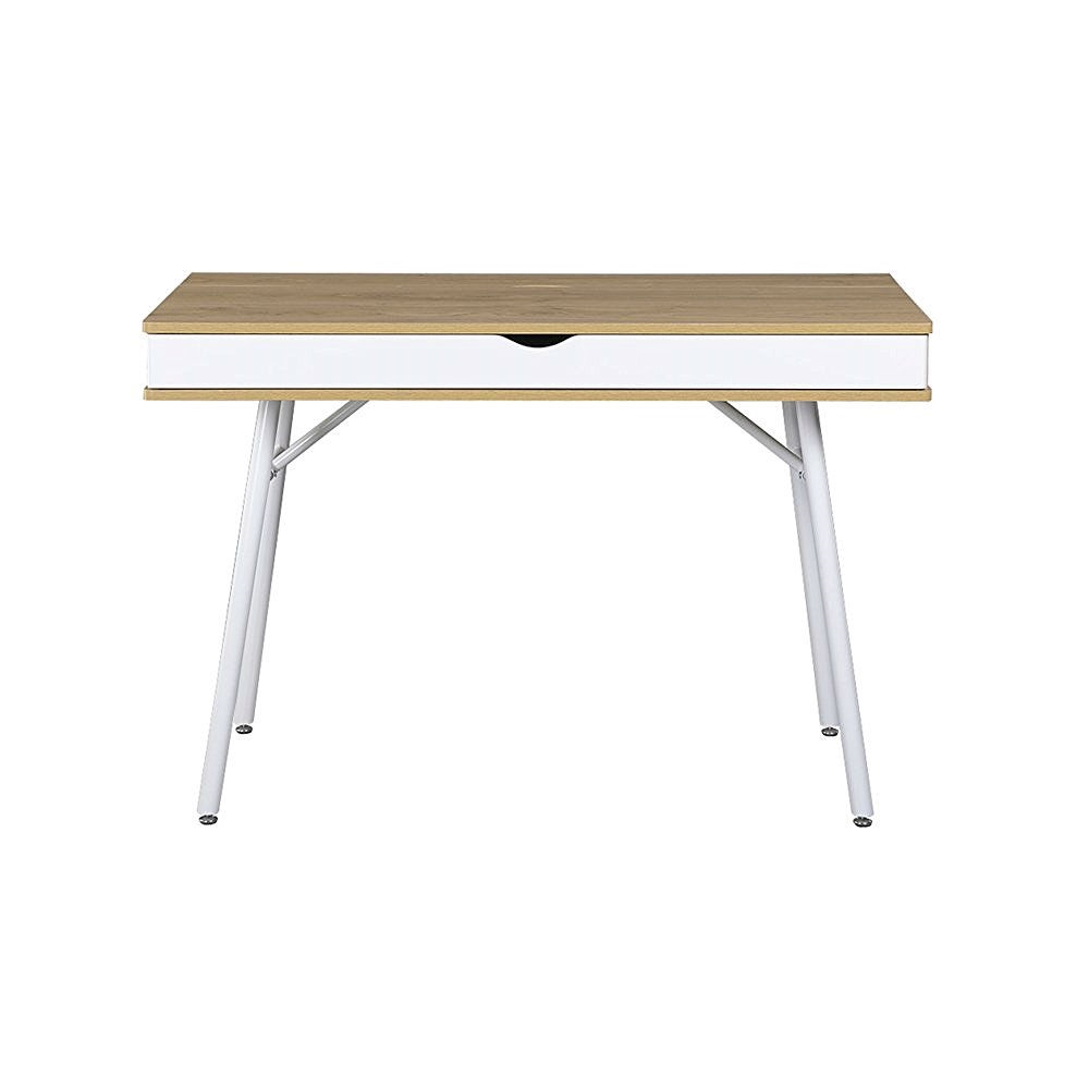 Designer Computer Workstation with Storage. Constructed out of particle board with paper laminate surface and powder coated steel legs. This Modern Heavy Duty Laptop Computer Desk with Storage Drawer in Pine Wood Finish features a full width multi-compartment storage drawer to store all of your accessories and it even has enough space for a laptop or tablet. It also includes a back storage compartment for cord management with an easy up and down cover. Easy and ready to assemble.