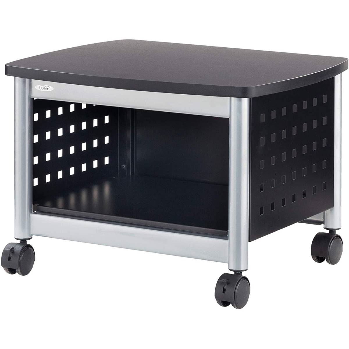 This Under-Desk Printer Stand Mobile Office Cart in Black and Silver is an easy way to free up desk space and keep additional printing supplies close at hand. Large enough to accommodate most desktop printers and other small office machines but is only 14-1/2" high for compact storage. Attractive black stand with unique hole pattern design and silver leg accents. Mobile on four casters, two locking. The stand hides printers and small office machines under most work-surfaces.