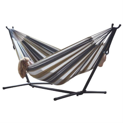 A top choice for couples lounging, this Desert Moon Pattern Cotton Hammock with 9-FT Steel Stand comes with a space-saving steel stand and a double hammock in your choice of cotton or Sunbrella fabric. You'll enjoy the freedom that the space-saving 9-foot stand provides by allowing you to set up your hammock in the most convenient location -- no longer having rely on tying your hammock to two trees. And both the Sunbrella and cotton hammocks accommodate two adults. The well-designed heavy duty steel stand gives you a sense of security to enjoy your slumber, and it's ideal for this non-spreader bar style of hammock. Created for long life and stability, it's made from heavy gauge steel and it easily assembles in minutes -- no tools required. Weighing in at a total of 35 pounds, this entire hammock combo can be easily maneuvered around your backyard or patio. Powder coated in an oil rubbed bronze finish, the stand measures 9 feet in length and all ends are finished with plastic caps. It's also easy to break down for storage or travel, and it comes with its own carrying case.