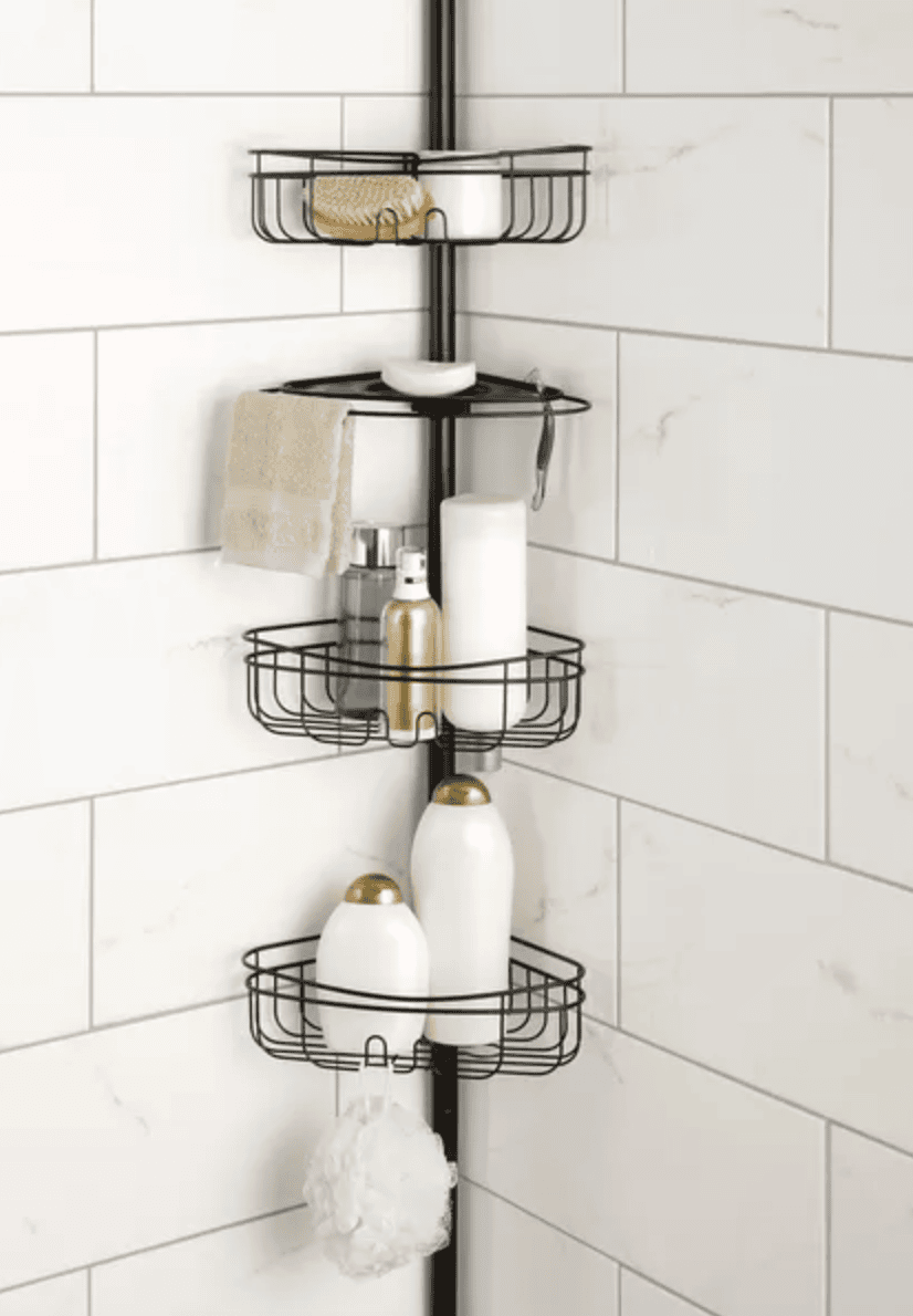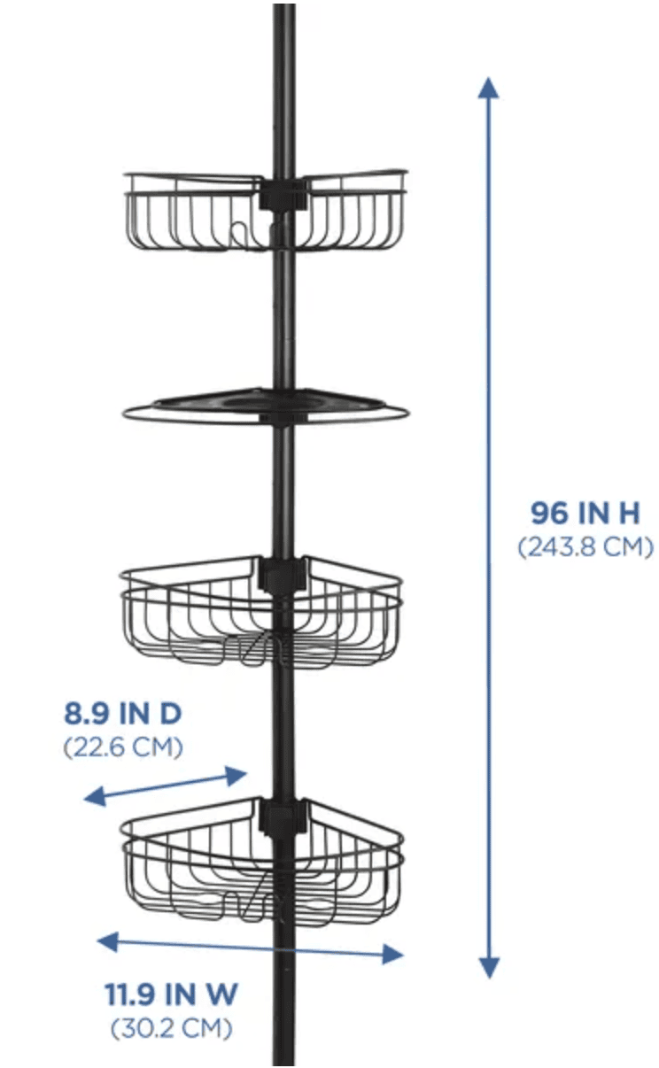 Adjustable Deep Baskets — Three sturdy baskets slide up and down the pole to fit your bottles, shaving supplies, and bath essentials.