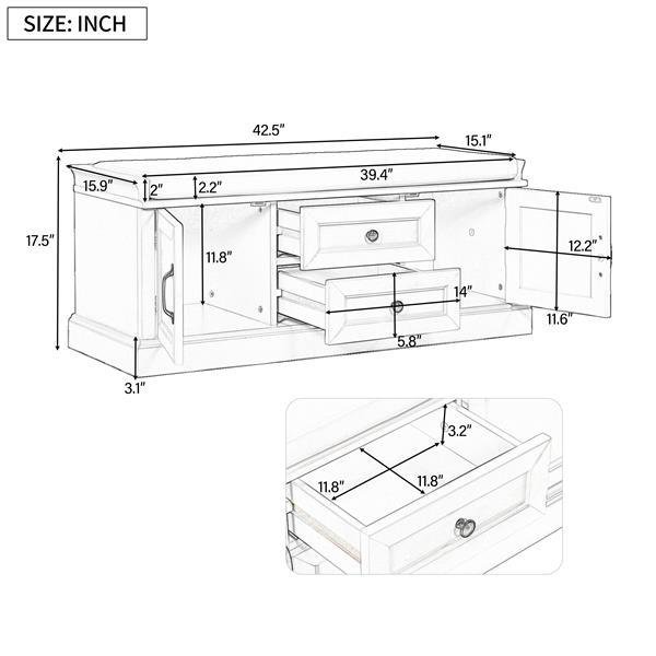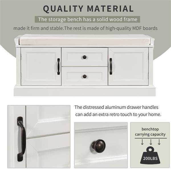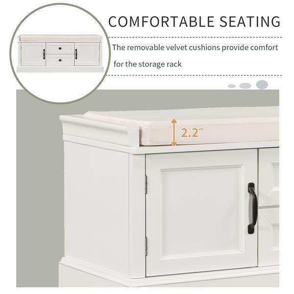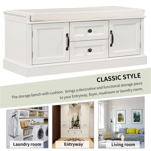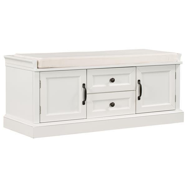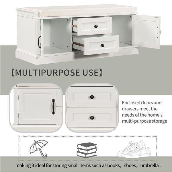 Storage Bench with 2 Drawers and 2 Cabinets, Shoe Bench with Removable Cushion for Living Room, Entryway (White)