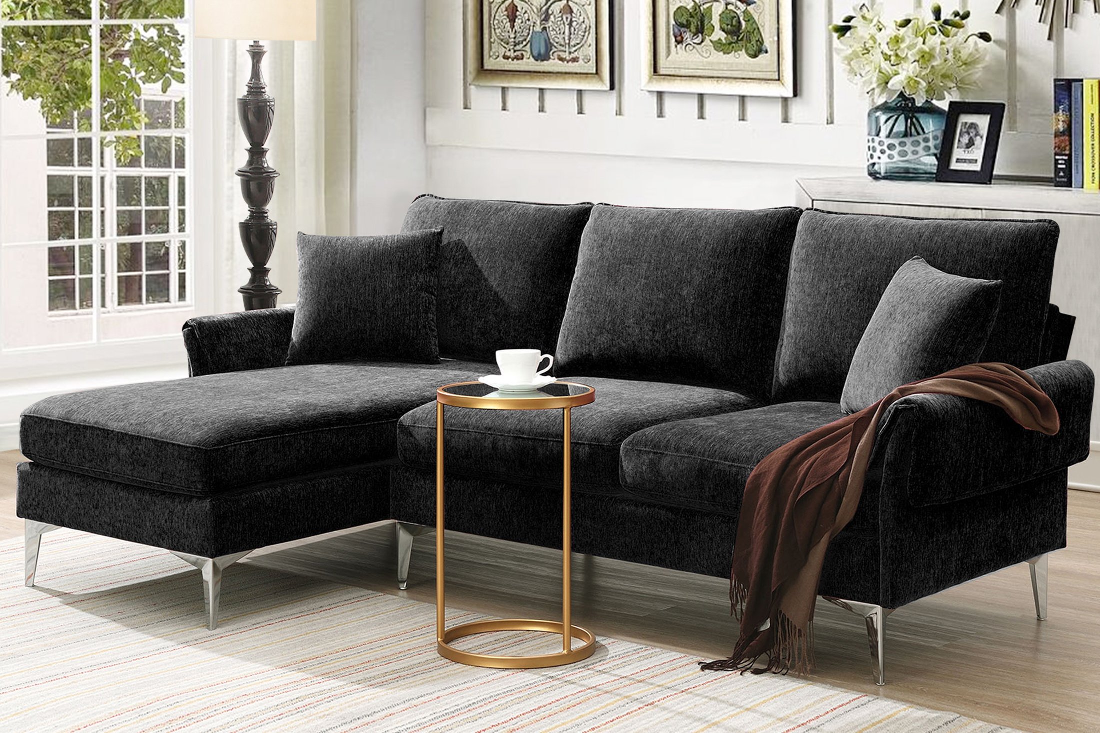 The distinctive armrest design adds a touch of style and uniqueness to the overall appearance of the L-shaped sofa, making it an attractive addition to any living space.The ability to interchange the chaise lounge allows for flexibility in arranging the sofa according to personal preference or room layout, adding versatility to the furniture. Wrapped in Chenille upholstery, this sectional introduces a touch of texture to your interior design, while chromed metal legs provide sturdy support and durability,round out this piece with a nod to contemporary style. Fit up to four on this sleek sectional sofa, the perfect addition to any den or living room ensemble!